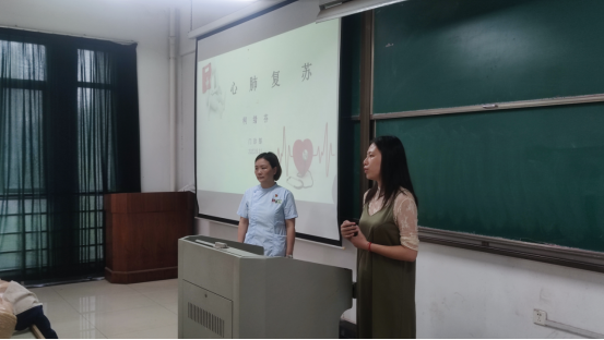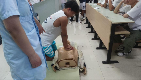 培训会上,柯绪芬护士长重点教授了心脏复苏、人口呼吸、海姆立克法等急救手段,强调时间就是生命,如心脏停止4-5分钟将会对大脑造成不可逆的伤害,所以掌握正确的急救方式非常重要。在培训会现场,主讲老师边介绍原理,边亲自演示急救手法,并再三强调注意事项。随后,多位同学上台利用假人练习心脏复苏方式,主讲老师进一步纠正了同学们的操作误区。最后,柯绪芬护士长又对运动扭伤、撞伤、抽筋等问题的应急处理方式进行了介绍,提醒同学们在运动中一定要注意安全,受伤后一定要科学处理,避免救助过程中二次受伤。