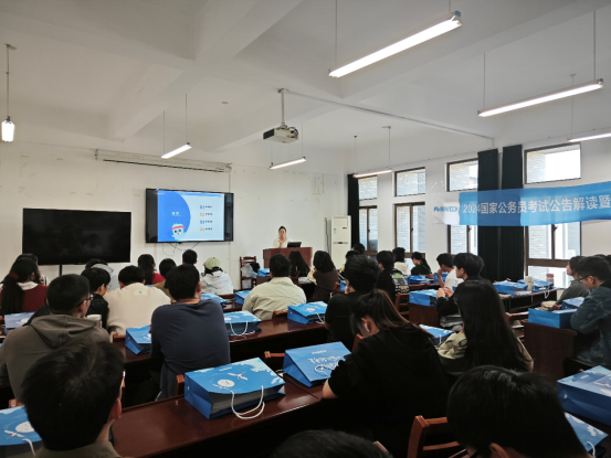 邀请粉笔公考教育讲师在机械楼404教室开展2024届毕业生公务员考试公告解读及报考指导讲座,40余名毕业生参加。