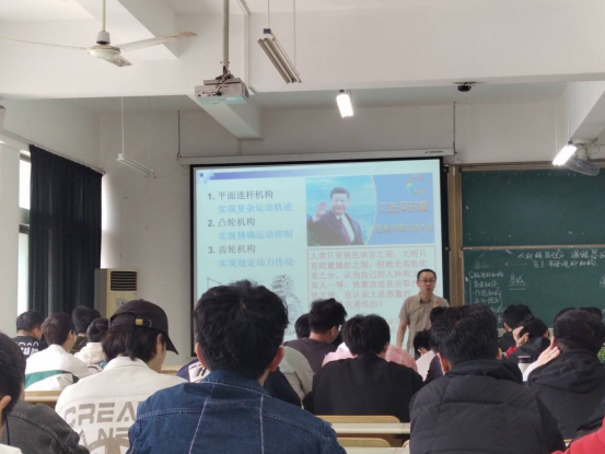 张鹏老师围绕《机械原理》中的“平面连杆机构”开展示范教学,讲述了常用机构的特性、连杆机构的组成、原理、分类与创新方法。首先由连杆、凸轮和齿轮机构的特有性能引出了习近平主席关于人类文明平等的重要论述,引导学生树立正确的世界观;然后通过引入国产先进军工、智能、物流装备的典型案例,深化了学生对铰链四杆机构工程应用的认知,坚定了学生的爱国主义热情;最后将连杆机构的创新方法联系到“二十大”报告中关于"守正创新″的重要论述,引导学生将技术方法论与思政方法论辩证统一。