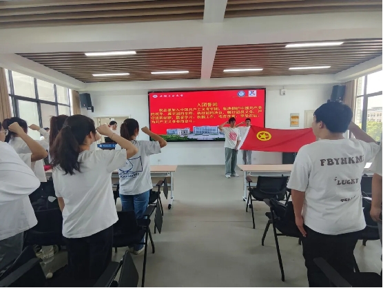 仪式在雄壮的《中华人民共和国国歌》声中拉开帷幕。卜齐春宣布新发展团员名单,并作为领誓人带领新发展团员在团旗前郑重宣誓,表达决心和信念。张美玲、陈洁为新发展团员代表佩戴团徽,颁发团员证。费晓月、陶京雪同学分别代表新、老团员上台发言,她们表示团员不仅是一个称号,更是一种责任和担当,希望大家以后继续不断学习和进步。