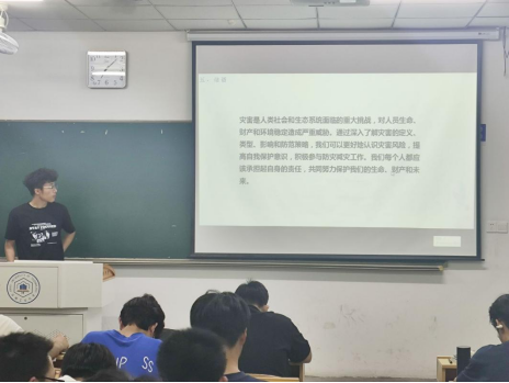 活动讲解了地震、洪水、泥石流、山体滑坡、台风、雷电、沙尘暴、火灾八个常见自然灾害发生前征兆、灾害来临时采取的应对措施及现场自救互救等安全知识,希望同学能够做到应知应会、入脑入心。同时,着重强调校园消防安全问题,针对不同场景、不同燃烧物的特点,通过事例介绍了不同类型火灾发生的原因及火灾预防、消防的基本知识,严禁在宿舍使用违规电器、乱扔烟头、私拉乱接电线等,通过常态化排查安全隐患、学习消防安全知识、增强消防安全意识,扎实推动平安校园建设