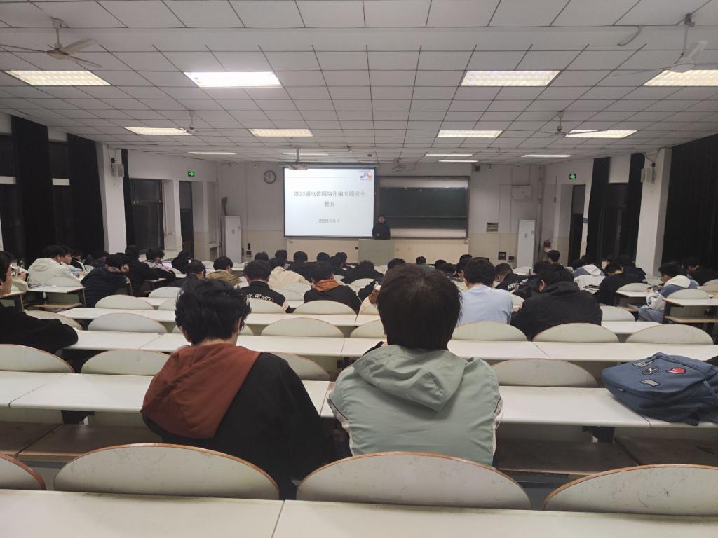 在阶教201召开2023级安全教育年级会暨防电信网络诈骗专题教育会,辅导员彭勇刚、2023级学生参加。