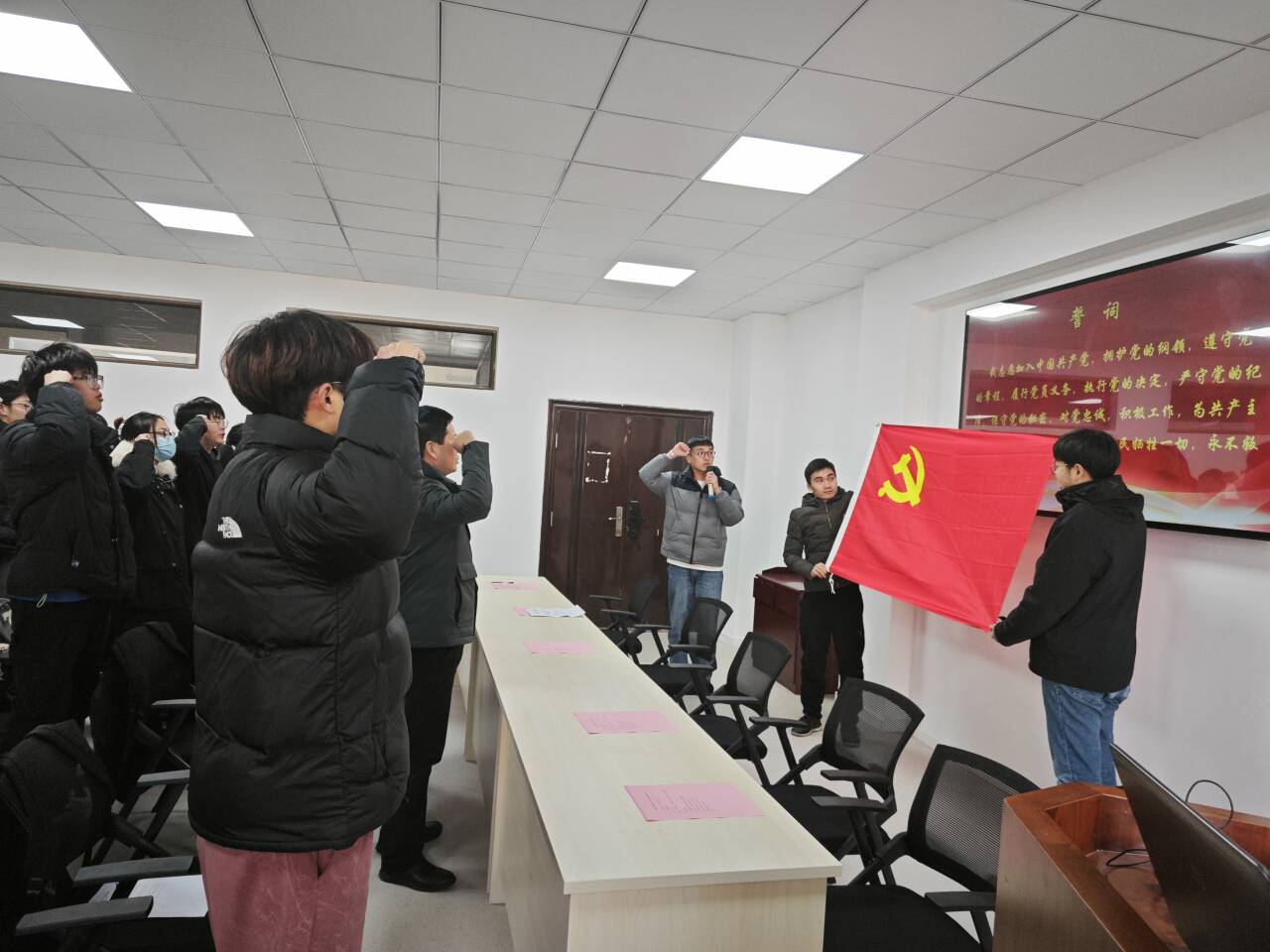 2023年下半年新发展党员入党宣誓仪式在机械楼404报告厅举行。院党委书记吴文兵、党委副书记陈庆林、各学生党支部书记、正式党员代表及2023年下半年45名新发展党员参加了仪式,仪式由院团委书记汪辉主持。