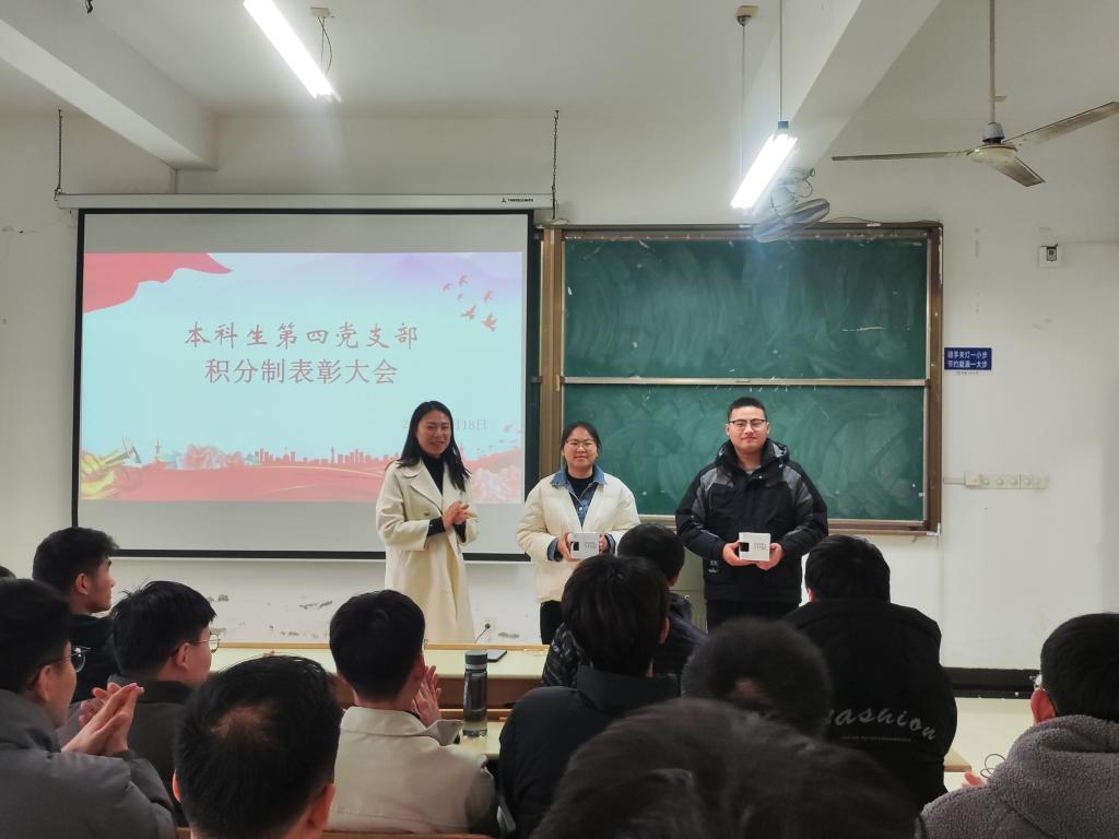 为进一步表彰先进,树立典型,激励广大学生党员充分发挥先锋模范作用。2024年3月19日,本科生第四党支部在机械楼405召开了积分制表彰大会,会议由支部书记濮莹萍主持,支部全体党员参加大会。