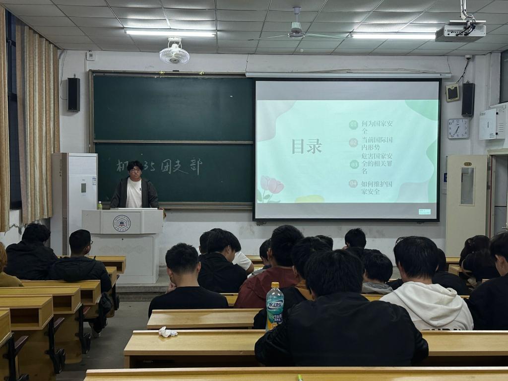 活动中,辅导员从“何为国家安全”、“当前国内外形势”、“如何维护国家安全”等方面内容,结合危害国家安全典型案件,向同学们深入讲述了国家安全的重要性,并引导同学们自觉维护国家安全。