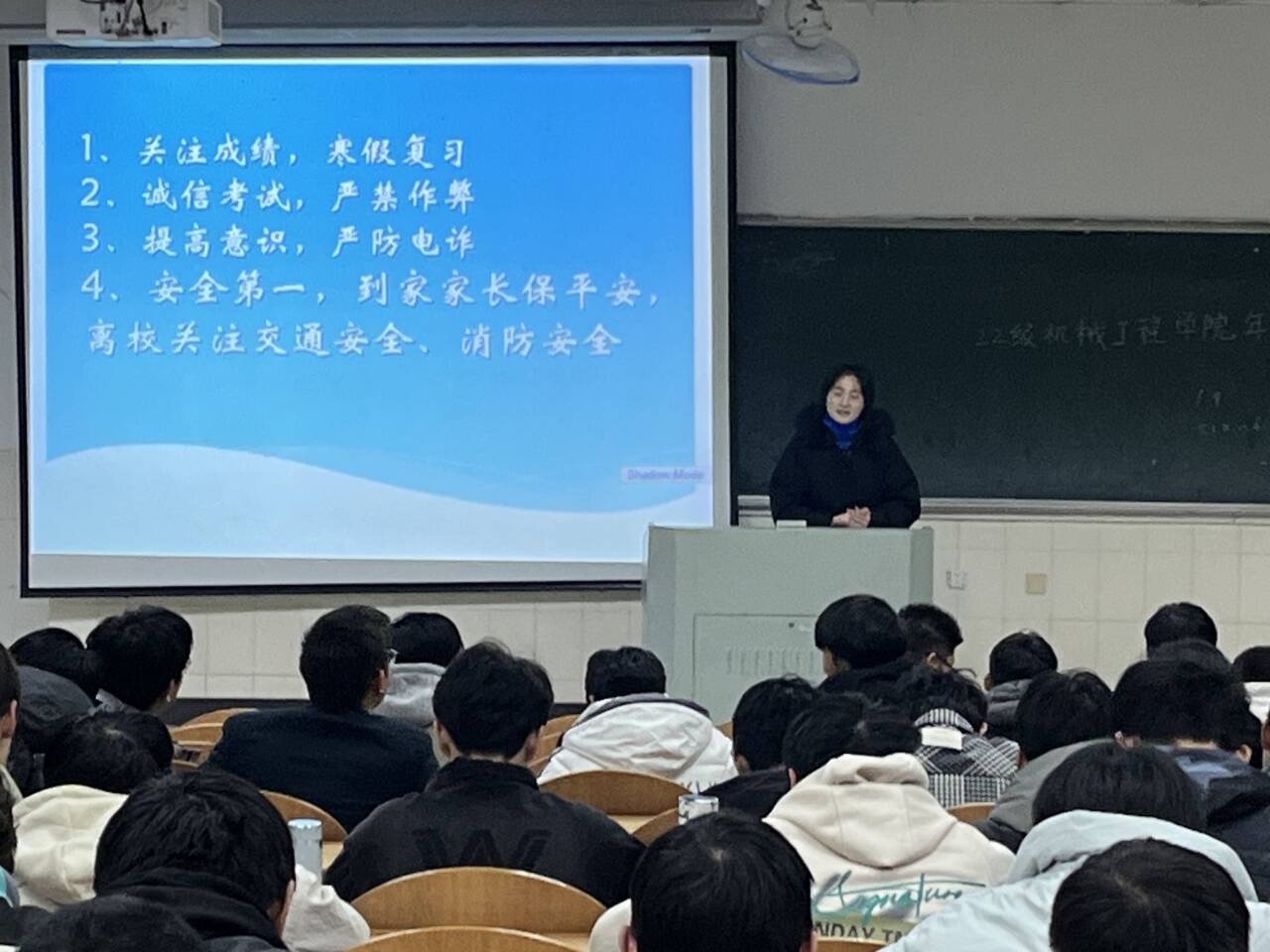 于秀山校区阶教102、103教室召开了2022级诚信考试暨寒假安全教育主题年级会,会议由2022级辅导员费白露、濮莹萍主持,2022级全体学生参加。