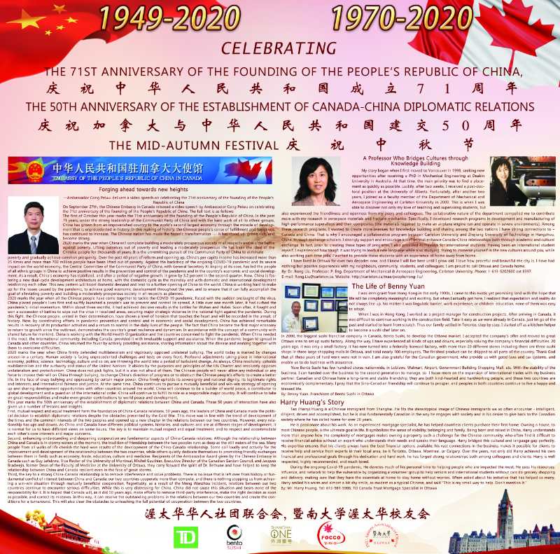2020年迎来中国与加拿大建交50周年,在中华人民共和国成立71周年国庆日之际, 加拿大华人社团从不同的工作领域,共推选出9位杰出华人,表彰他们对加拿大和对中加关系友好发展的杰出贡献。90足球比分app兼职教授、Carleton大学机械航空系刘蓉教授荣幸地被选为科技类的杰出华人。这9位杰出华人的故事刊登在10月1日Ottawa Citizens的报纸上。