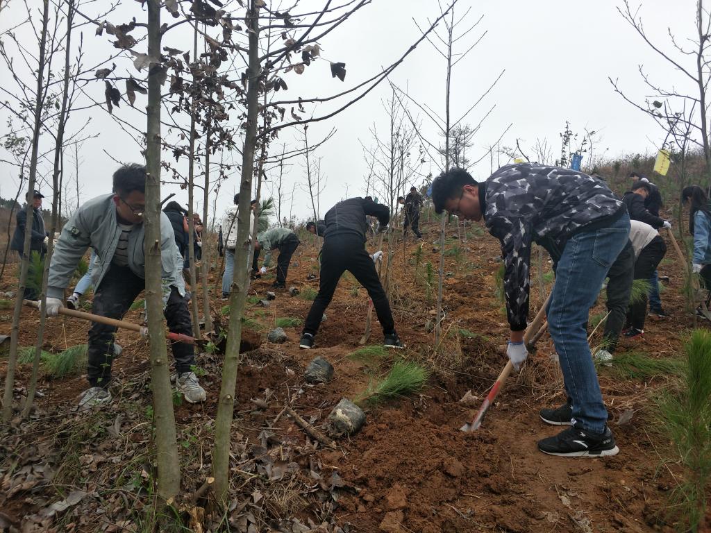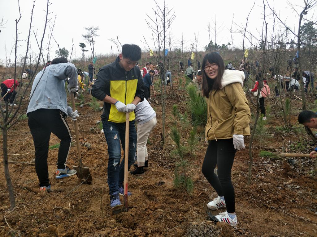 挖坑,捣土,放苗,踩实,同学们分工合作,忙的不亦乐乎。望着一棵棵绿色小树苗渐渐布满秀山校区的山头,喜悦之情难以言表。