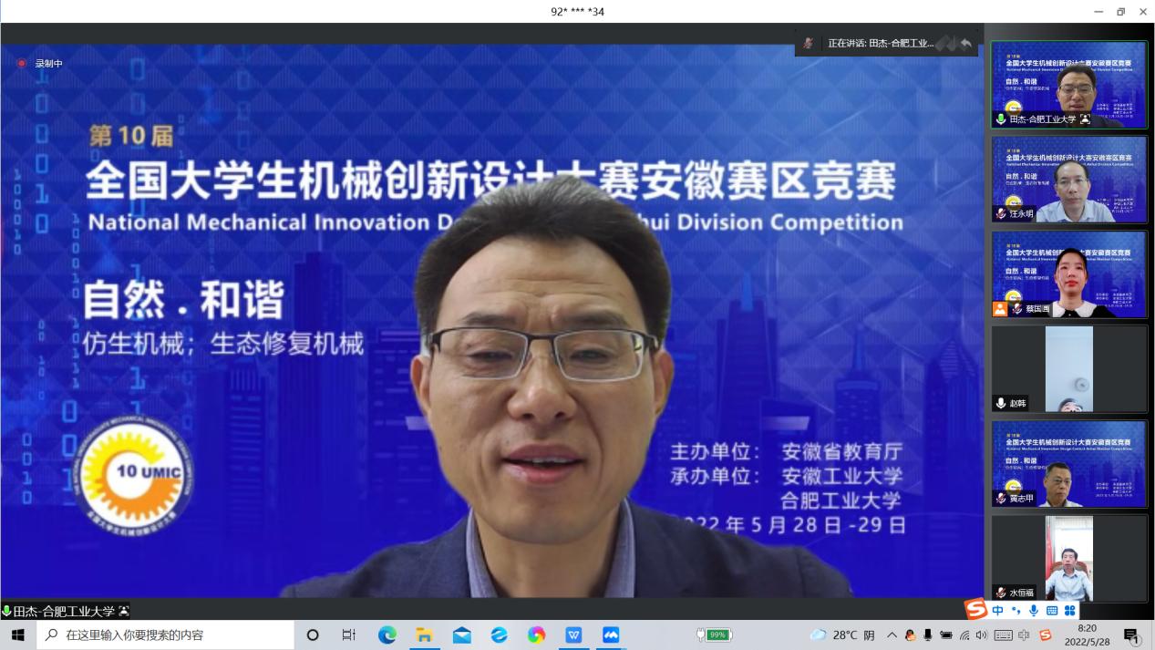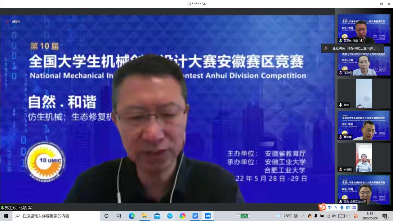 2022年5月28至29日,由安徽省教育厅主办,安徽工业大学与合肥工业大学联合承办的2022年第十届全国大学生机械创新设计大赛安徽赛区竞赛在90足球比分app成功举行。本次大赛主题为“自然·和谐”。受疫情影响,本次省赛全程线上举行。开幕式上,90足球比分app党委常委、副校长水恒福教授,赛事评审委员会主任委员、合肥工业大学赵韩教授,全国大学生机械创新设计大赛组委会委员、大赛秘书长、西安交通大学王晶教授,全国大学生机械创新设计大赛组委会委员、安徽赛事秘书长、合肥工业大学田杰教授,90分钟足球