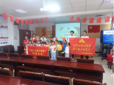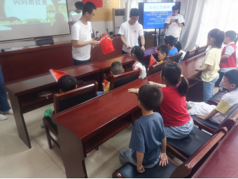 图为实践队员为小盆友们分发小红旗