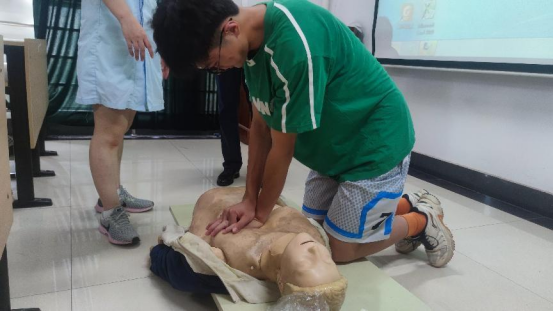 培训会上,柯绪芬护士长重点教授了心脏复苏、人口呼吸、海姆立克法等急救手段,强调时间就是生命,如心脏停止4-5分钟将会对大脑造成不可逆的伤害,所以掌握正确的急救方式非常重要。在培训会现场,主讲老师边介绍原理,边亲自演示急救手法,并再三强调注意事项。随后,多位同学上台利用假人练习心脏复苏方式,主讲老师进一步纠正了同学们的操作误区。最后,柯绪芬护士长又对运动扭伤、撞伤、抽筋等问题的应急处理方式进行了介绍,提醒同学们在运动中一定要注意安全,受伤后一定要科学处理,避免救助过程中二次受伤。