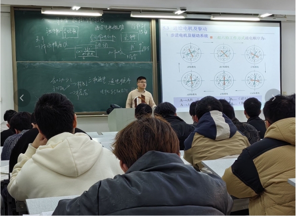 夏宏军老师围绕《数控技术》课程中的“伺服驱动系统”章节展开示范教学,讲授了步进电机的定义和分类、工作原理、驱动系统以及主要性能指标等内容。首先通过数控装置中的典型视频案例引出步进电机结构的主要组成部分,向学生分析了其结构特点;然后讲解了步进电机在数控系统中的应用、工作方式以及其优缺点;最后讲解了步进电机的主要特性。多媒体教学与板书教学的结合使学生更加直观地理解了步进电机的相关知识点。