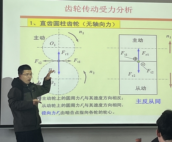 王瑞锋老师围绕《机械设计》课程中的“齿轮传动”章节展开示范教学,讲授了齿轮传动的地位、特点、分类以及设计思路等内容。首先以跑出“世界速度”的高铁、大国重器“锦绣号”盾构机以及“嫦娥”探月月球车等,引出齿轮传动的重要性,进一步分析了齿轮传动的特点和分类;然后结合板书系统讲述了齿轮设计的思路;最后通过具体案例对不同类型的齿轮传动进行受力分析。整个讲授过程让学生对齿轮传动有了宏观的认知,激发了学生的民族自豪感和科技报国的使命感。