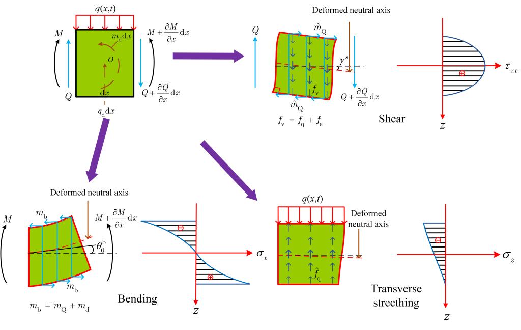 此外,为准确预测平面深梁的振动、弯曲和屈曲响应,本研究采用变形分解方法,提出了一种精确、高效而通用的高阶剪切变形梁理论。该理论基于弹性力学,将梁的变形分解为弯曲、剪切和挤压三个相对独立的部分进行精确分析,并根据不同变形间的内在联系(平衡关系)避免了额外变量的引入,针对平面梁的静力、振动和屈曲问题获得了高精度的响应结果。物理意义清晰、计算方便高效、响应预测精准,可进一步应用于非均质材料、多场耦合、强非线性等复杂梁问题。相关研究成果发表在《Engineering Structures》,论文与浙江大学合作完成,90足球比分app为论文第一单位,90分钟足球