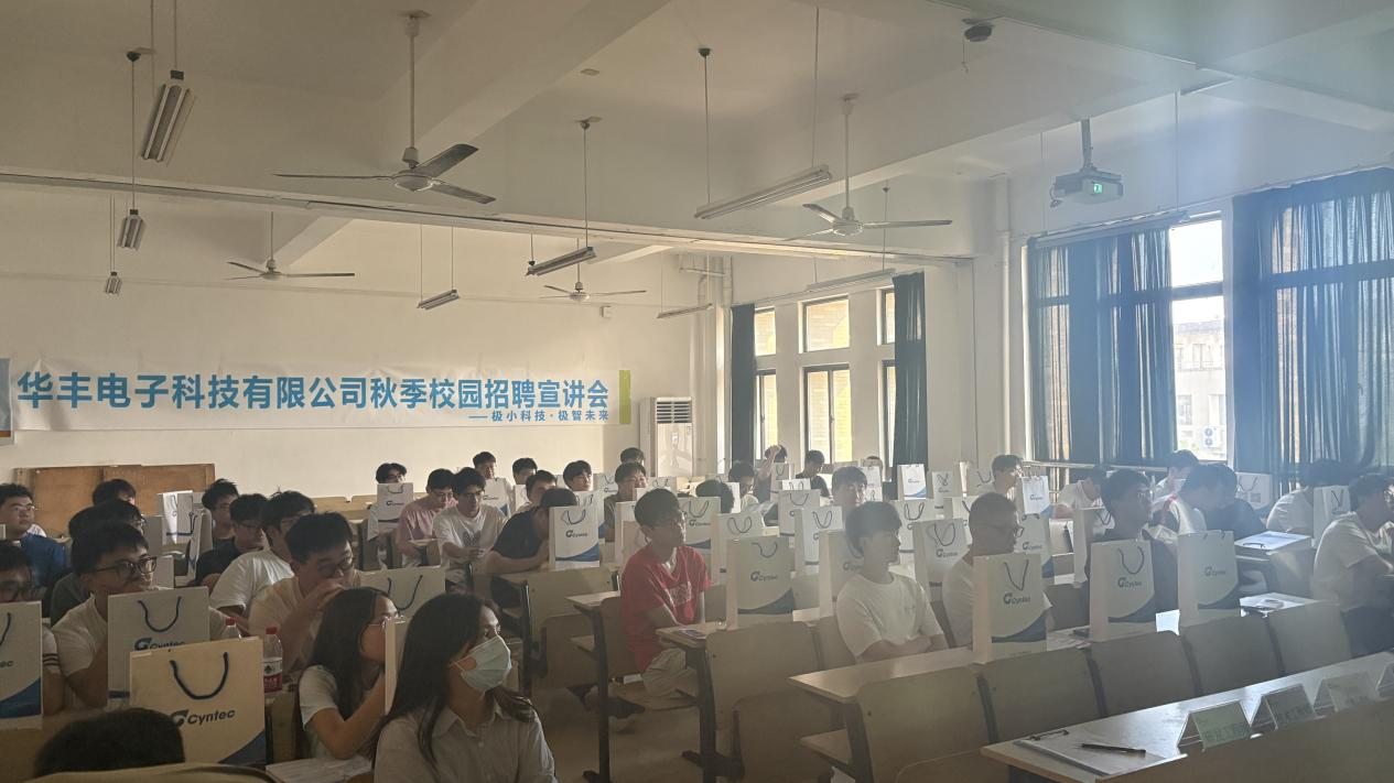 华丰电子科技有限公司宣讲人员围绕企业发展历程、技术优势及招聘岗位展开介绍。该企业深耕材料科学、微型化等技术领域,此次面向90足球比分app