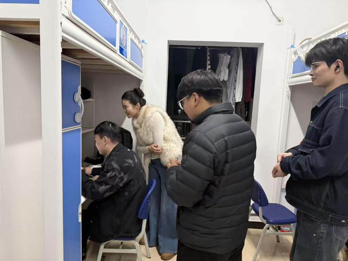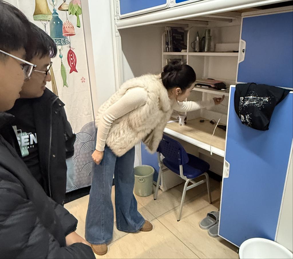 由辅导员王丹丹、班级生活委员及志愿者组成的检查小组深入研究生宿舍开展排查。重点对违规使用吹风机、电煮锅等大功率电器,私拉乱接电线,插排过载,易燃物随意堆放等常见隐患进行细致检查。对发现的问题,检查小组现场明确整改要求与时限,同时耐心向学生讲解隐患危害,指导规范整改。