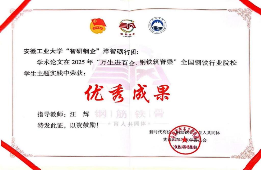 “智研钢企”淬智砺行团学术论文成功获得“优秀成果”奖项。