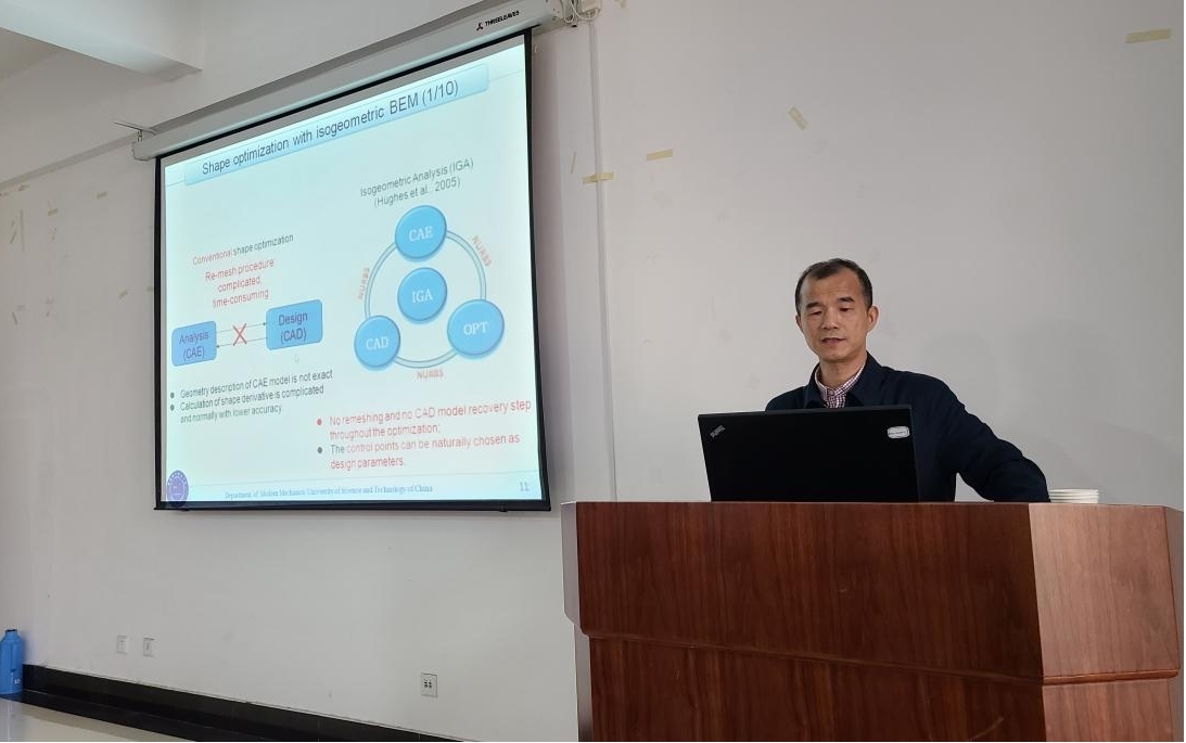 陈海波教授的报告采用全英文形式,讲解详细,内容丰富,知识体系严密,引入了很多新的思想方法和概念,如提高计算效率的宽频快速多极算法和伴随向量算法,提高有限元模型描述精度、实现几何模型和有限元模型无缝融合的等几何方法、基于流固耦合的边界元拓扑优化设计方法等。报告提到的这些新方法和理念对机械、力学等相关专业师生具有很好的启发作用。最后相关老师和研究生对感兴趣的等几何法等方面的问题和陈海波教授进行了深入交流。