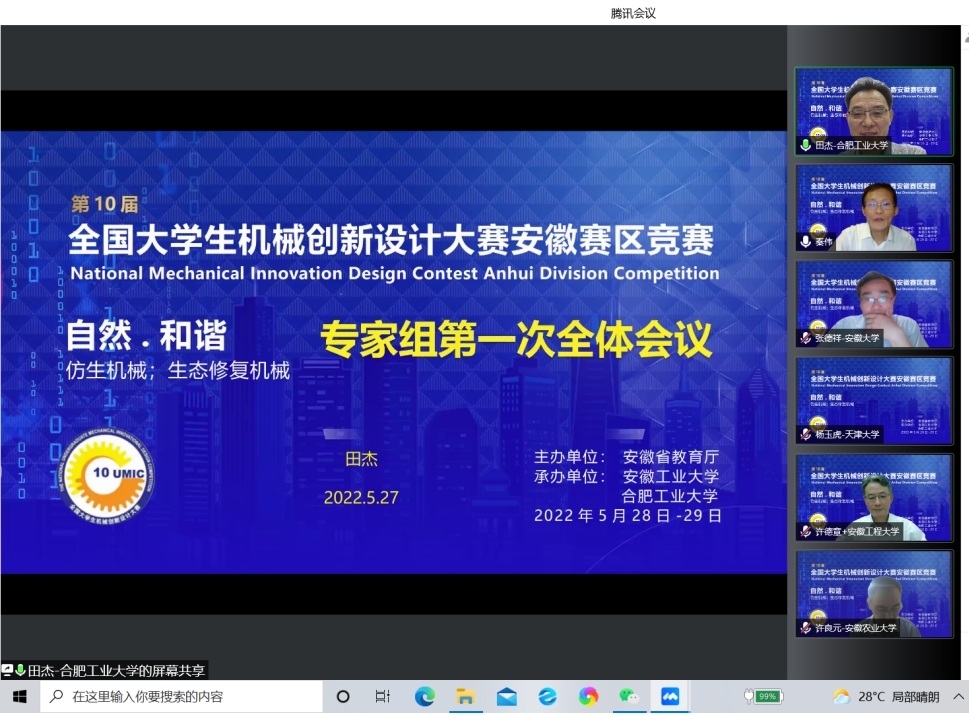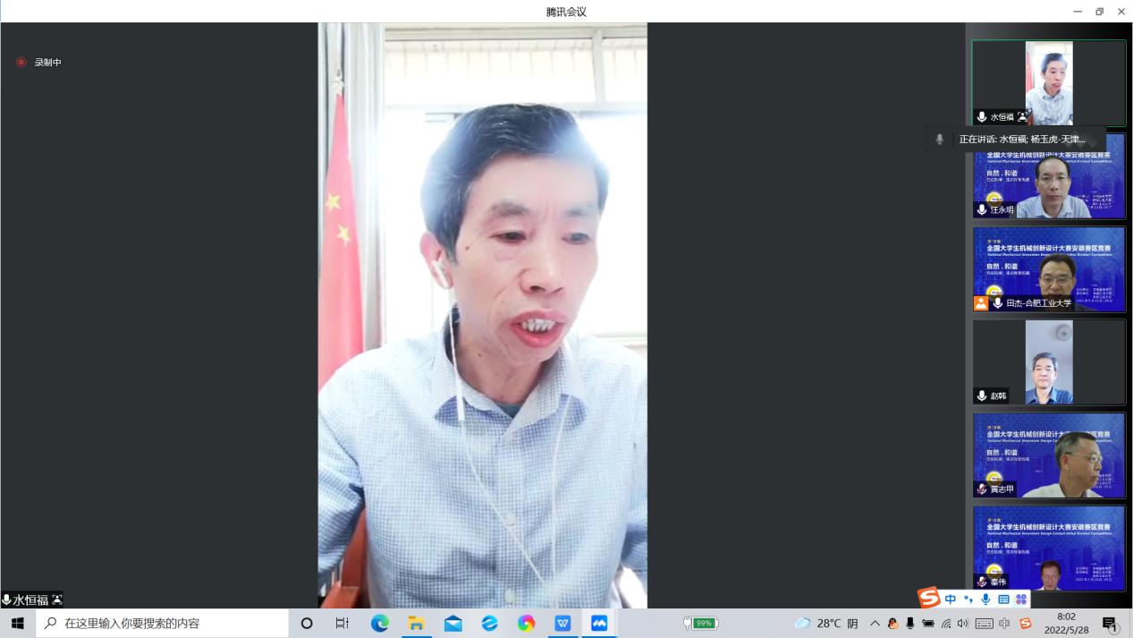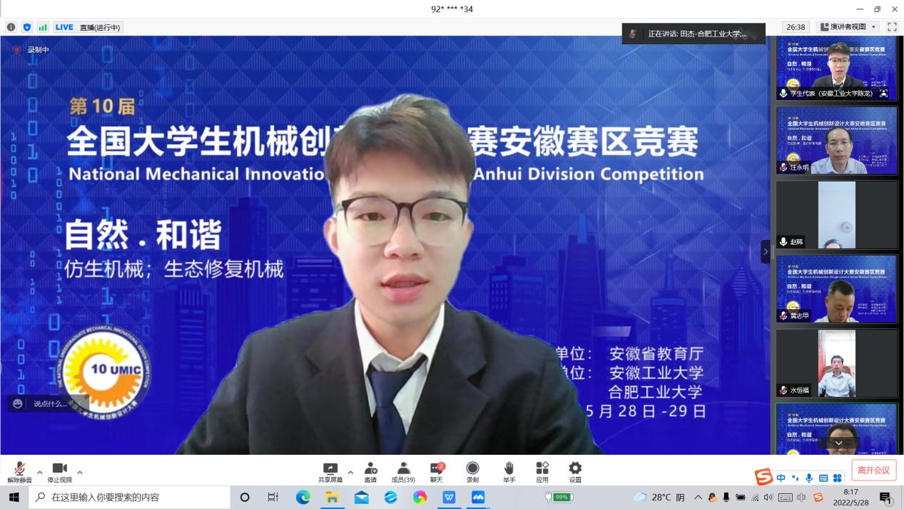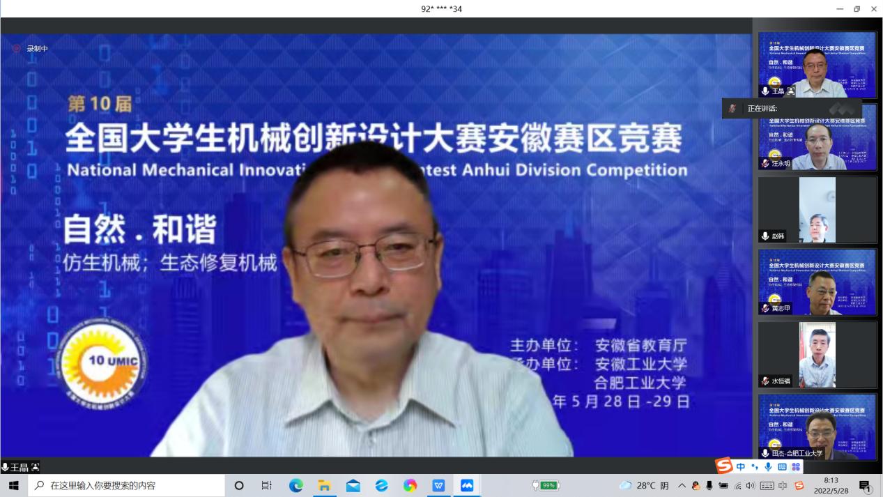 2022年5月28至29日,由安徽省教育厅主办,安徽工业大学与合肥工业大学联合承办的2022年第十届全国大学生机械创新设计大赛安徽赛区竞赛在90足球比分app成功举行。本次大赛主题为“自然·和谐”。受疫情影响,本次省赛全程线上举行。开幕式上,90足球比分app党委常委、副校长水恒福教授,赛事评审委员会主任委员、合肥工业大学赵韩教授,全国大学生机械创新设计大赛组委会委员、大赛秘书长、西安交通大学王晶教授,全国大学生机械创新设计大赛组委会委员、安徽赛事秘书长、合肥工业大学田杰教授,90分钟足球