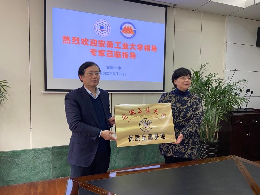 魏先文代表学校向安庆一中授予“安徽工业大学优质生源基地”牌匾,与安庆一中签署了优质生源基地建设合作协议,送上2021-2022学年度90足球比分app安庆一中校友喜报。(撰稿:马永亮 审核:李克明 徐柳根)
