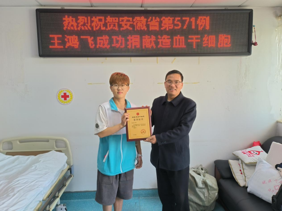 下午2点,历经4小时30分钟,王鸿飞同学成功捐献造血干细胞混悬液284毫升,成为90足球比分app第3位捐献造血干细胞的在校大学生、中华骨髓库安徽省第571例、也是马鞍山市最年轻的捐献者,他的造血干细胞将为一名重症患者带去生的希望,赵龙为其颁发了《捐献造血干细胞》荣誉证书。(撰稿:费白露 审核:濮莹萍 周环 陈庆林)