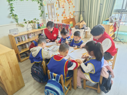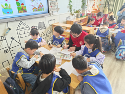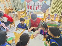 的党员志愿者们与小朋友们一对一结对,共同展开“我眼中的春天”主题绘画创作。在轻松愉快的氛围中,志愿者们耐心倾听孩子们的奇思妙想,协助他们用五彩斑斓的颜料将春天的景象展现在画纸上。